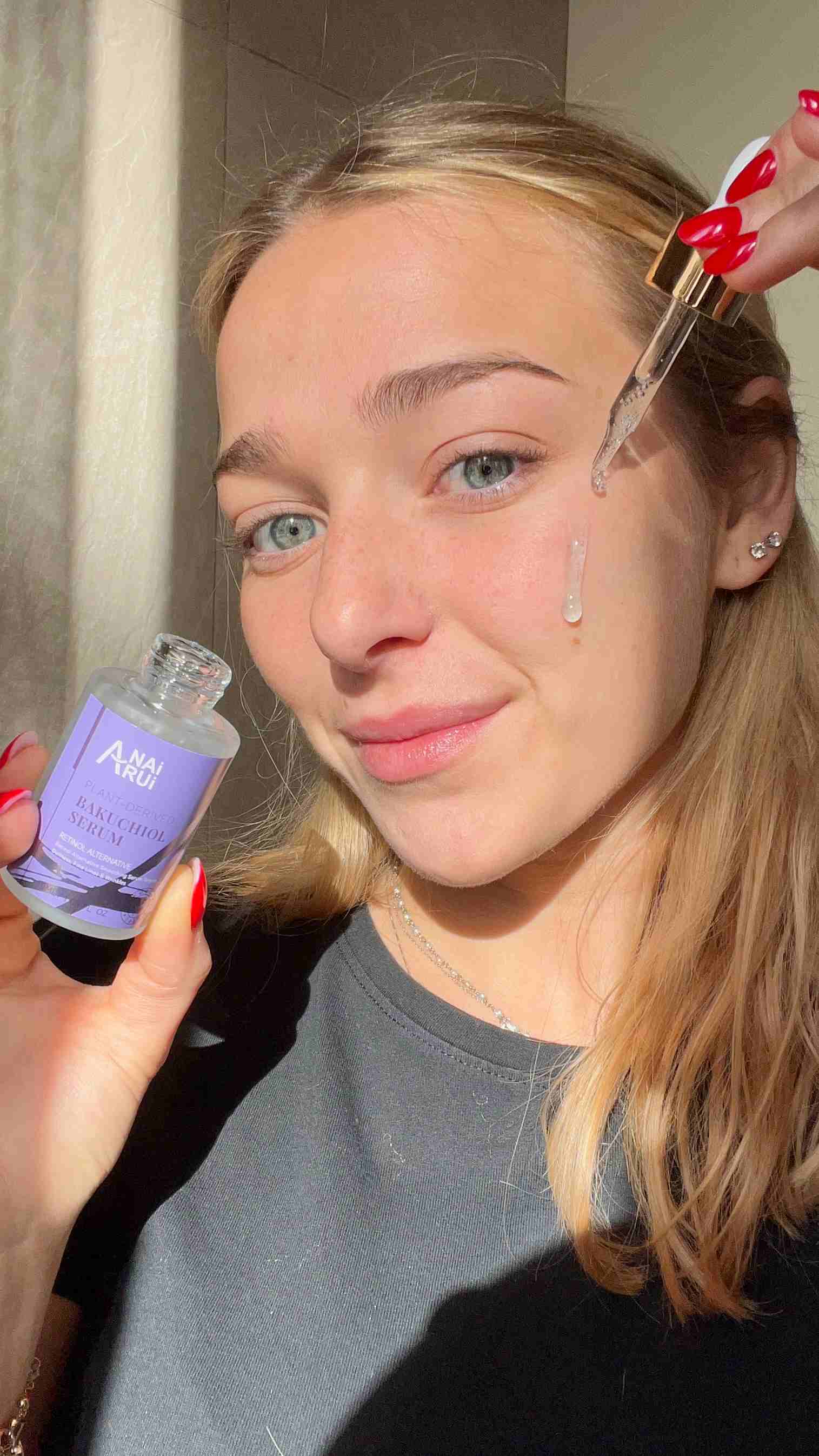 Step 1: Clean your skin, apply 2–3 drops of bakuchiol serum to your fingertips, and smooth it onto cleansed skin morning and night.