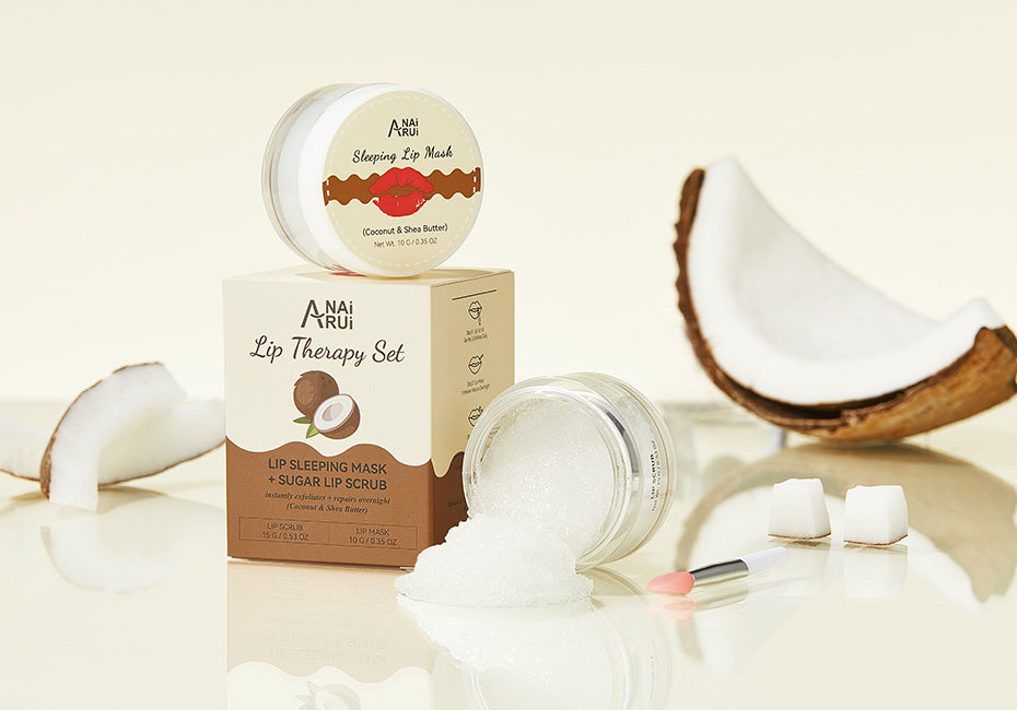 The ANAIRUI Coconut Lip Care Set is a 2-step lip therapy kit that includes a coconut lip scrub and an overnight lip sleeping mask. Infused with coconut oil, shea butter, and vitamin E, it hydrates, nourishes, and softens lips while you sleep, leaving them smooth, plump, and naturally glowing.