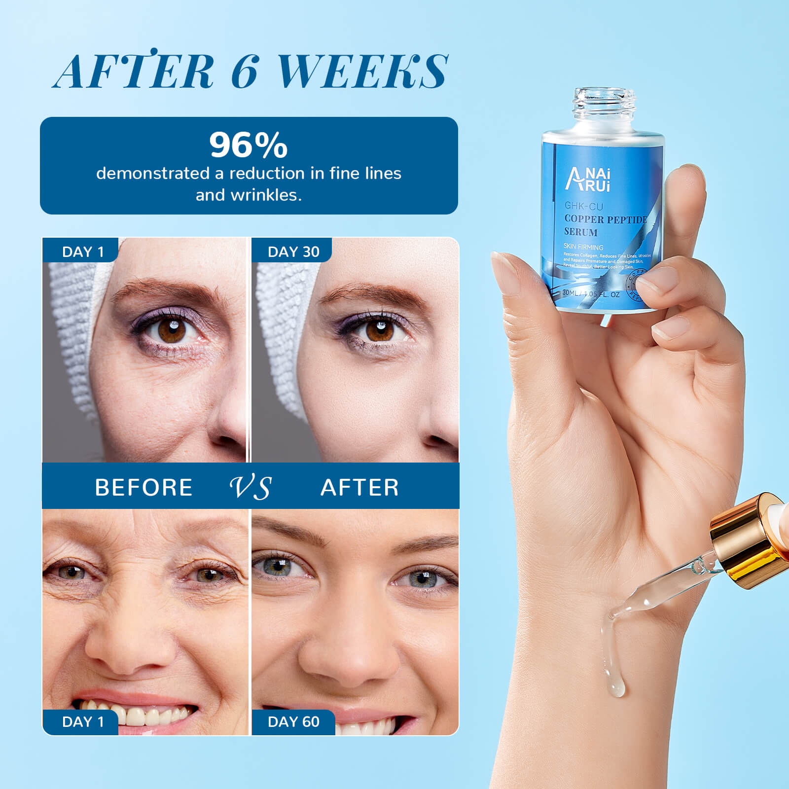 1% Copper peptide. Our copper peptide serum is an effective anti-aging serum. It rebuilds collagen, and reduces fine lines and wrinkles. Improve skin elasticity, firmness, helping to maintain a youthful appearance.